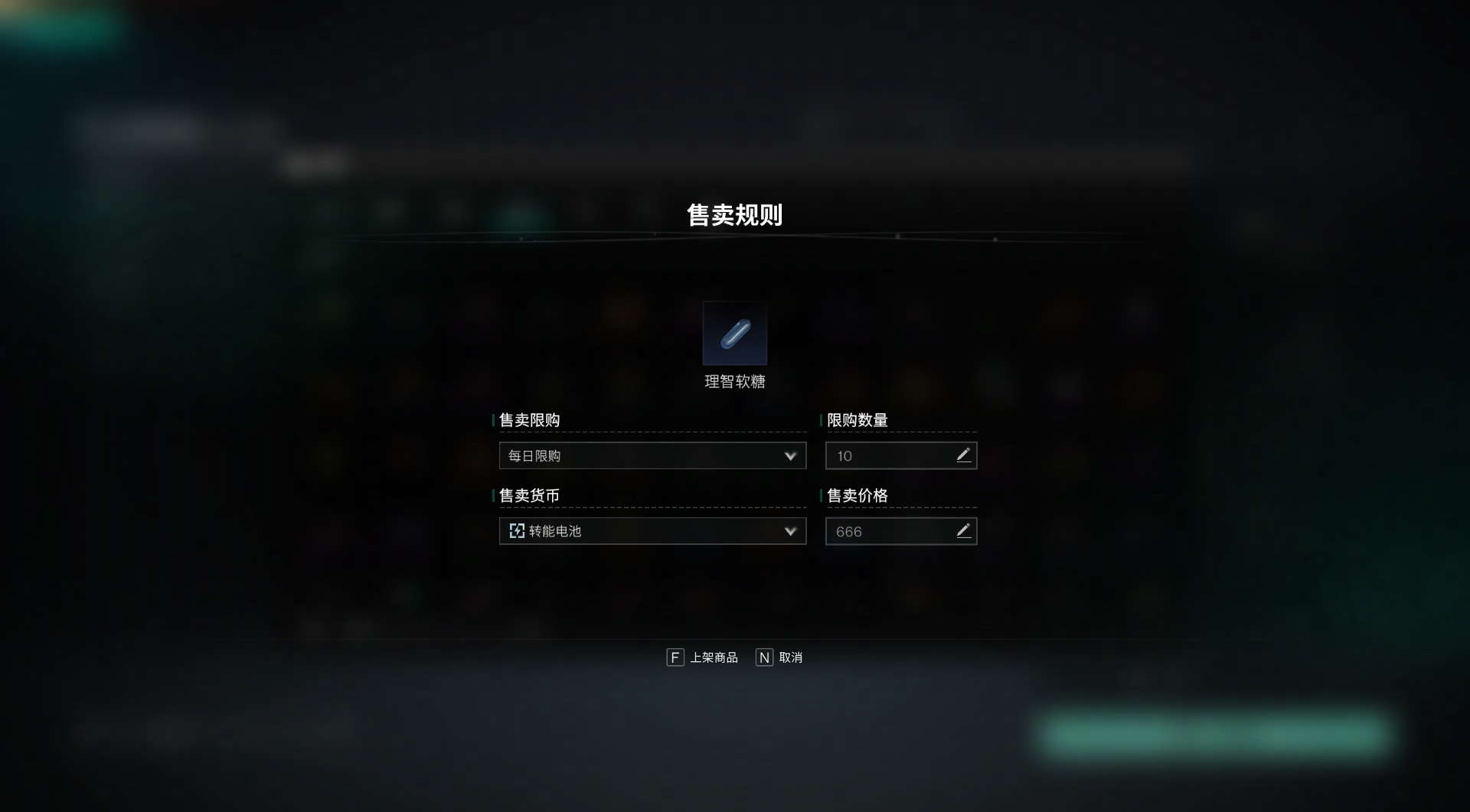 在选定要售卖的物品后,服主可以对该物品的可售数量、售卖货币以及售卖价格进行设置。