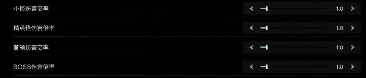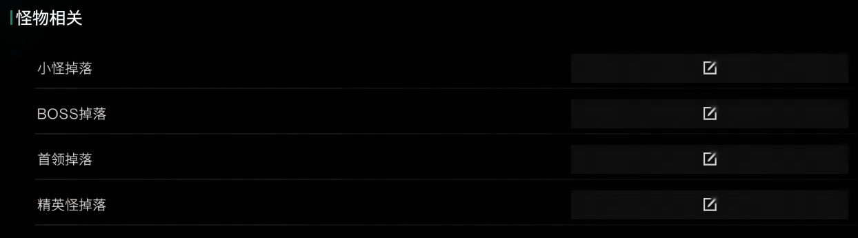 可调整五种怪物相关的参数,分别是生命、伤害、移动速度、仇恨距离、警戒灵敏度。每种参数又细分成四类怪物,分别是小怪、精英怪、首领、BOSS。