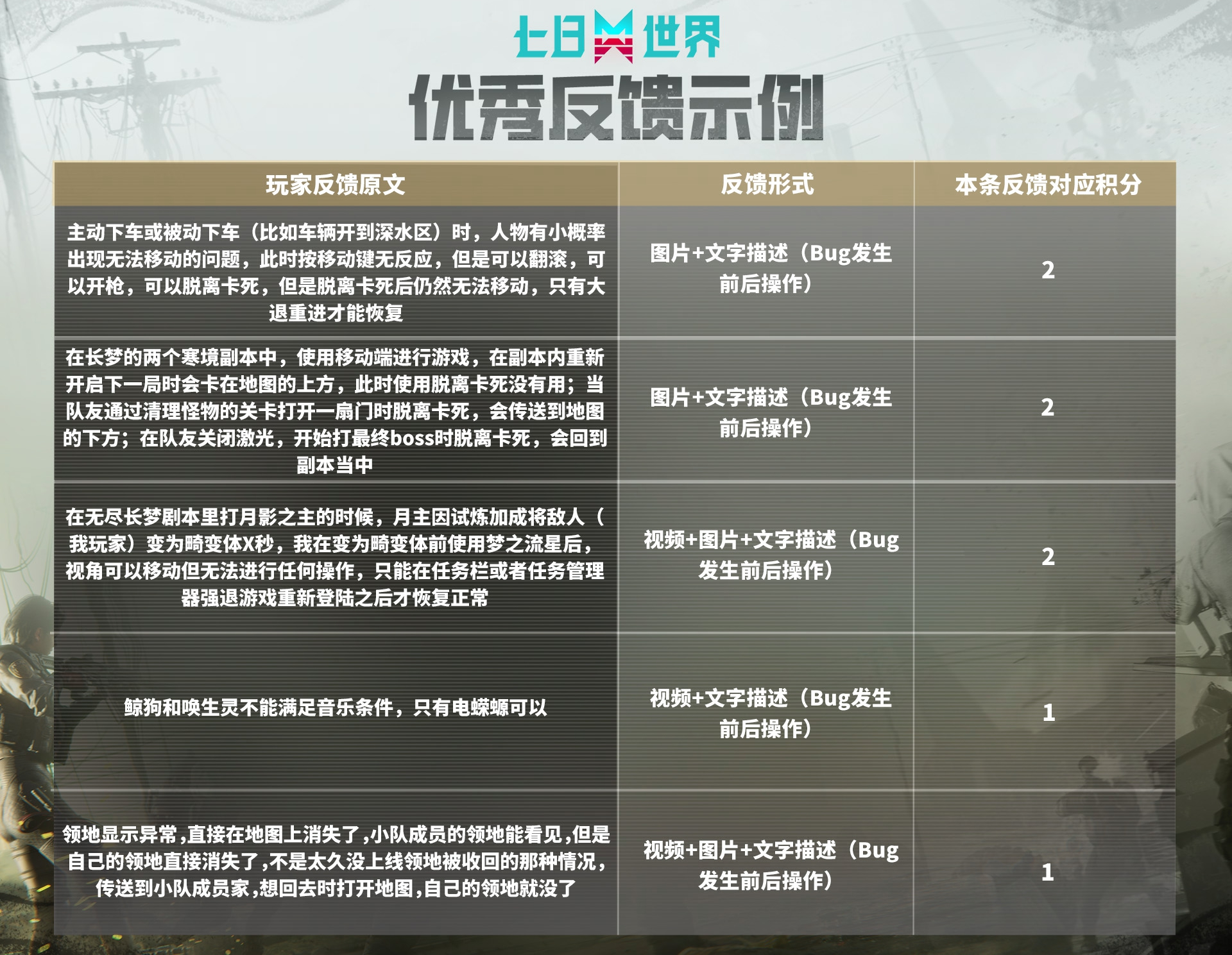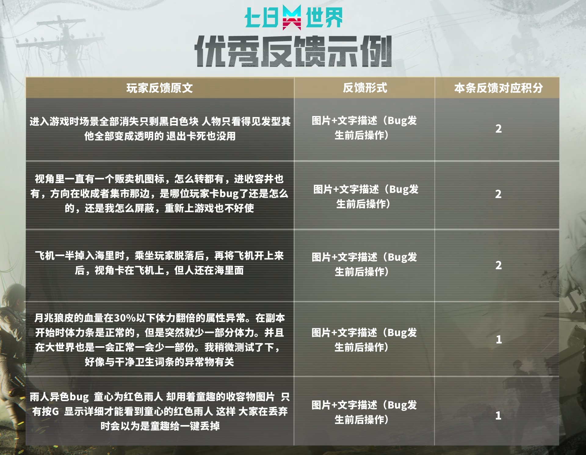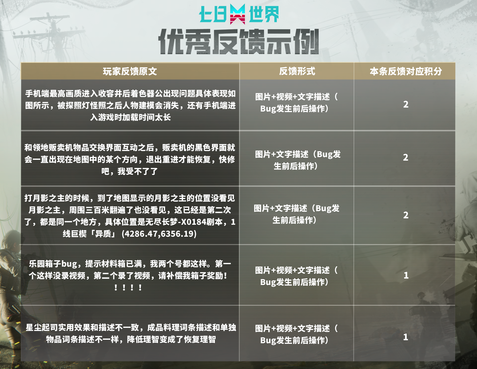 听说江湖有传言称七日世界是Bug世界?策划不信邪并表示“没有的事儿!”奈科特大陆的所有超越者们,请尽情反馈游戏中遇到的像小虫子一样讨厌的Bug吧!有效反馈越多,奖励越丰厚!快来参与这场与Bug的大对战吧!