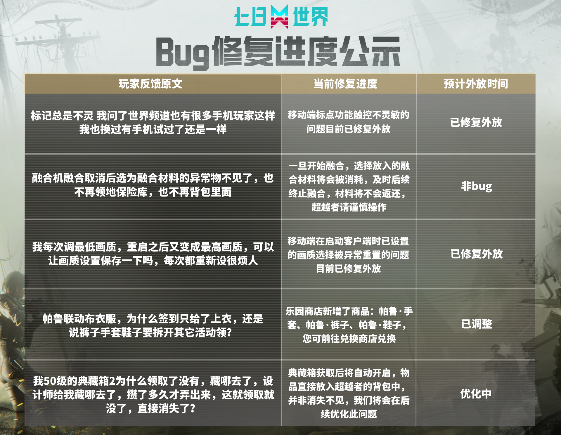 目前活动已结束,在活动期间,我们一共收到了34282条玩家反馈,其中有效Bug反馈31538条,共计提炼出692个问题工单,其中526个定位为Bug问题,已外放262个Bug修复(高频反馈问题优先修复),余263个Bug问题仍在持续查证并加快修复中。感谢大家对本次【捉虫有奖行动】活动的支持和喜爱,也希望各位超越者在奈科特大陆游玩过程中再遇到疑似Bug问题时,能继续通过游戏内客服渠道持续跟我们进行反馈!